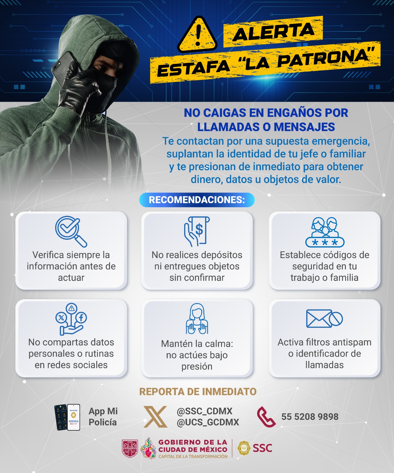 La Secretaría de Seguridad Ciudadana de la Ciudad de México advirtió que los ciberdelincuentes han perfeccionado este esquema al punto de construir historias creíbles en tiempo real, utilizando datos obtenidos de redes sociales para suplantar identidades y simular emergencias.