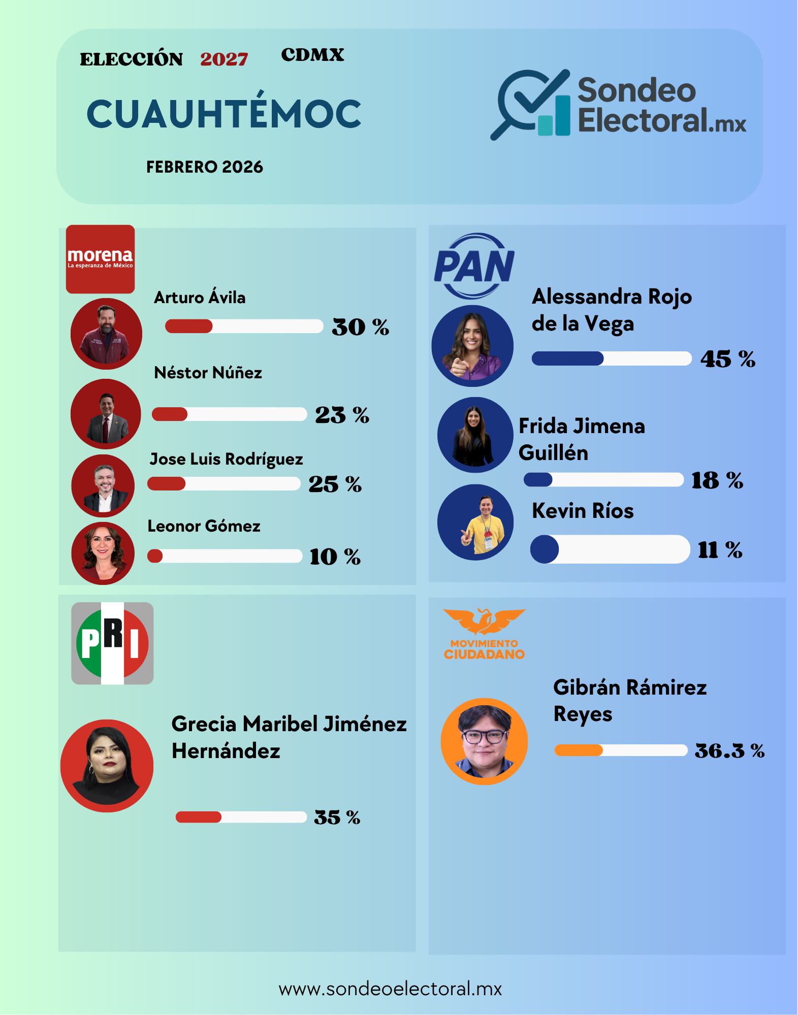 Por su parte, Movimiento Ciudadano también se posicionaba con fuerza con Gibrán Ramírez (36.3%), evidenciando que la disputa no sería exclusiva entre Morena y el PAN.